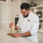 Men's chef's jacket, an evolution of CARDAMONE, a two-material model combining breathable mesh fabric for the sleeves and back. With its turned-down shirt collar, front bib and central opening concealed by a hidden placket, it embodies the perfect combination of elegance and functionality for professional chefs on show.