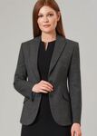 54% Polyester, 44% Wool, 2% LYCRA® Elastane. Semi fitted, 2 button jacket, lapel & pocket contrast detail, 1 inside pocket, centre vent, tailored back panels Centre back length at size 12R = 63cm