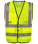 Conforms to EN ISO 20471: 2013 + A1: 2016 class 2.Open mesh around the middle section.Front button closure.Two reflective bands around the body and one over each shoulder.Media and pen pocket with D-ring on right chest.ID pocket.Two bottom pockets with flaps.Longer back.Cut out label.Large area on reverse for decoration.